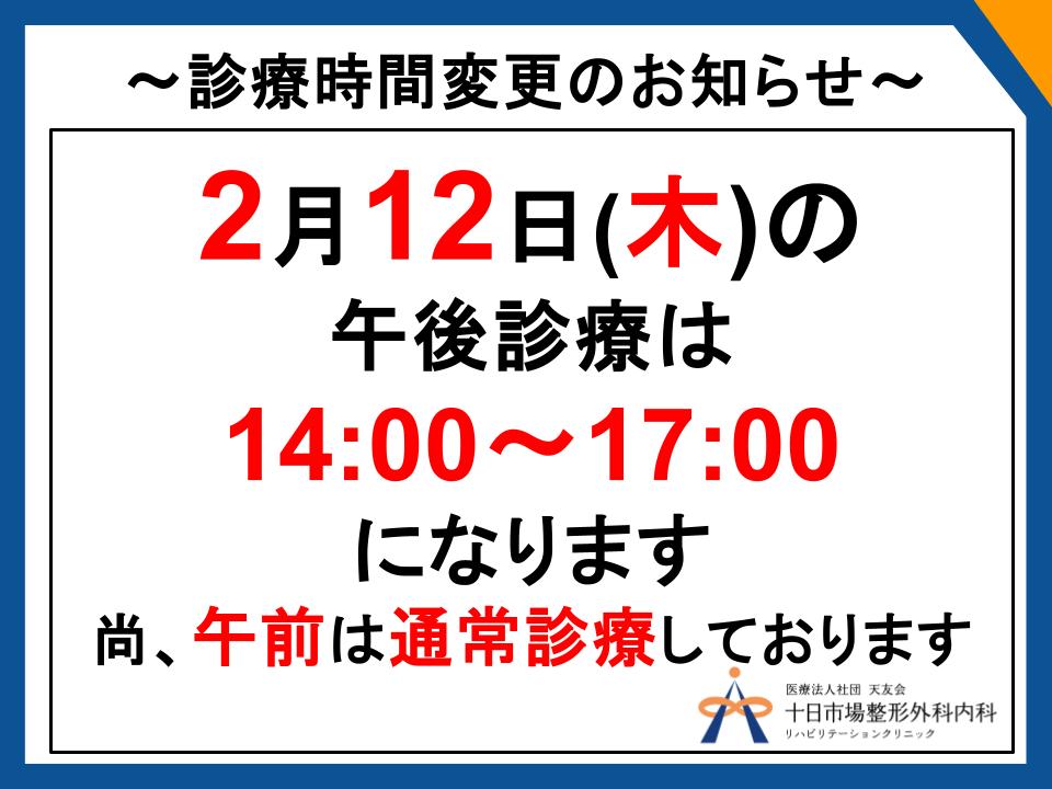 2月12日(木)午後診療時間変更のお知らせ 2026.01.29 令和8年2月12(木)は院内研修のため、午後の診療時間が14:00~17:00となります。 受付時間は13:45~となります。 尚、午前は通常通り診療を行います。 大変ご不便をおかけしますが、何卒よろしくお願い申し上げます。
